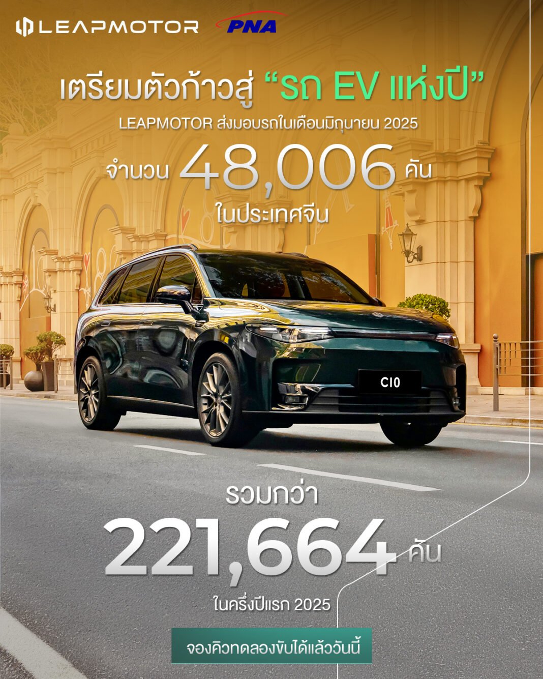 Leapmotor ก้าวสู่จุดสูงสุดในสมรภูมิรถยนต์พลังงานใหม่ (NEV) ด้วยการคว้า อันดับ 1 ด้านยอดขายรวม ในกลุ่มบริษัทสตาร์ทอัพผู้ผลิตรถยนต์ NEV ของจีน ประจำเดือนมิถุนายน 2025 พร้อมครองแชมป์ยอดขายรวม ตลอดครึ่งปีแรกของปี 2025 ตอกย้ำศักยภาพการเติบโตแบบก้าวกระโดด ท่ามกลางการแข่งขันที่รุนแรงในตลาดรถยนต์ไฟฟ้า เดือนมิถุนายน 2025 ถือเป็นอีกหนึ่งหมุดหมายสำคัญของ Leapmotor กับยอดส่งมอบ สูงสุดเป็นประวัติการณ์ที่ 48,006 คัน เติบโตถึง 138% เมื่อเทียบปีต่อปี (YoY) และยังเป็นเดือนที่ 6 ติดต่อกันที่ Leapmotor มีตัวเลขการส่งมอบเพิ่มขึ้นอย่างต่อเนื่อง จาก 25,170 คันในเดือนมกราคม สู่ 48,006 คันในเดือนมิถุนายน หรือเพิ่มขึ้นถึง 91% ในช่วงครึ่งปีแรก ความสำเร็จนี้สะท้อนถึงการดำเนินงานที่เป็นระบบ ทั้งในด้าน การจัดการซัพพลายเชนอย่างมีประสิทธิภาพ การพัฒนาผลิตภัณฑ์ที่ตรงใจผู้บริโภค และความเชื่อมั่นที่เพิ่มขึ้นอย่างต่อเนื่องในแบรนด์ Leapmotor ยอดขายสะสมของ Leapmotor ในช่วงครึ่งแรกของปี 2025 รวมกว่า 221,664 คัน ขึ้นแท่น อันดับ 1 ในกลุ่มสตาร์ทอัพ NEV ของจีนอย่างมั่นคง Leapmotor ยังคงเดินหน้าสานต่อความสำเร็จจากปี 2024 ซึ่งสามารถส่งมอบรถได้ถึง 293,724 คัน เติบโตเกือบเท่าตัวจากปี 2023 เปลี่ยนสถานะจาก ผู้ท้าชิง สู่ ผู้นำเบอร์หนึ่ง ของกลุ่มผู้ผลิตรถยนต์พลังงานใหม่สตาร์ทอัพจีนอย่างเต็มภาคภูมิ