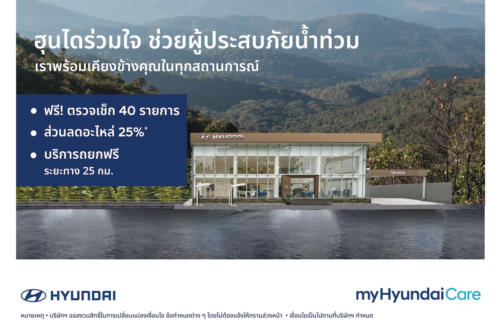 ท่ามกลางสถานการณ์อุทกภัยที่ยังส่งผลกระทบต่อหลายจังหวัดในภาคใต้ ทำให้ประชาชนจำนวนมาก โดยเฉพาะผู้ใช้รถยนต์ ต้องเผชิญความเสียหายจากน้ำท่วมอย่างไม่ทันตั้งตัว บริษัท ฮุนได โมบิลิตี้ (ประเทศไทย) จำกัด ขอร่วมบรรเทาความเดือดร้อนของลูกค้าผ่านมาตรการช่วยเหลือเร่งด่วนสำหรับรถยนต์ที่ได้รับผลกระทบ ด้วยบริการตรวจเช็กสภาพรถฟรี 40 รายการ และส่วนลดค่าอะไหล่แท้ฮุนได 25% สำหรับงานซ่อมมูลค่า 50,000 บาทขึ้นไป (ไม่รวมผลิตภัณฑ์หล่อลื่นและของเหลวทุกชนิด) เพื่อลดภาระค่าใช้จ่ายและช่วยให้รถของท่านกลับมาพร้อมใช้งานได้อย่างมั่นใจ โดยทีมช่างผู้เชี่ยวชาญจะตรวจประเมินความเสียหายอย่างละเอียดตามมาตรฐานศูนย์บริการ