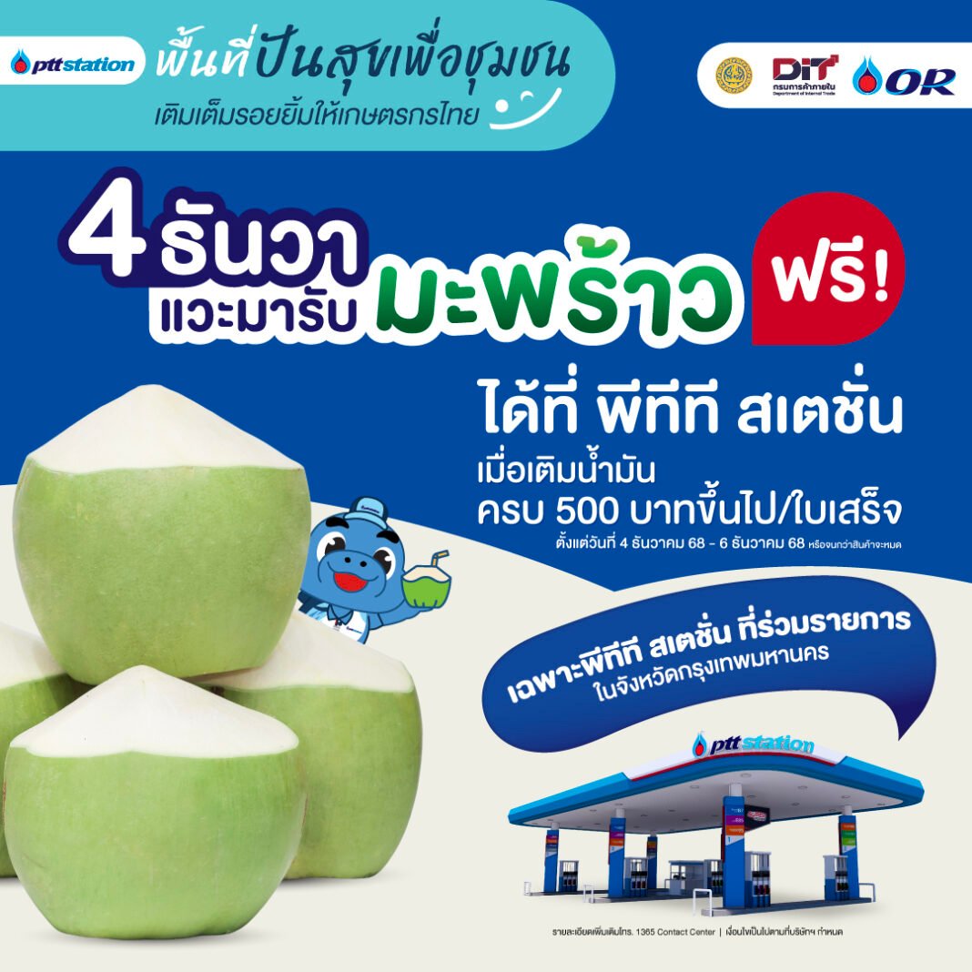 เติมน้ำมัน แจกฟรี! มะพร้าว กว่า 20,000 ลูก ระหว่างวันที่ 4 – 6 ธันวาคม 2568 เฉพาะสถานีฯ ในกรุงเทพฯ ที่ร่วมรายการ