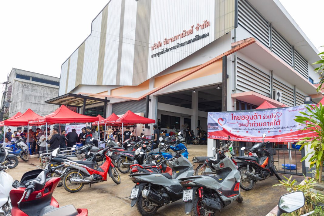 ไทยฮอนด้า ร่วมกับร้านผู้จำหน่ายรถจักรยานยนต์ฮอนด้าทั่วประเทศ เดินหน้าช่วยเหลือผู้ประสบภัยภาคใต้ภายใต้โครงการ “ไทยฮอนด้า ร่วมใจสู้ภัยน้ำท่วมภาคใต้” โดยส่งทีมช่างมืออาชีพ และอาสาสมัครช่างศูนย์บริการฮอนด้าจากทั่วประเทศกว่า 200 คน พร้อมอุปกรณ์ช่างครบชุด บินตรงลงพื้นที่หาดใหญ่เพื่อให้บริการตรวจเช็กและซ่อมรถที่ได้รับผลกระทบจากน้ำท่วมอย่างเร่งด่วน หลังมีประชาชนนำรถเข้ารับบริการมากกว่า 1,000 คัน ภายในวันแรก
