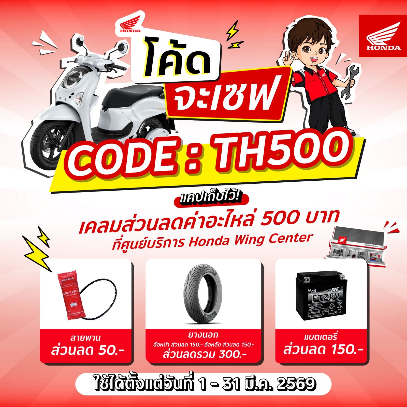 รถจักรยานยนต์ฮอนด้า ชวนผู้ใช้รถจักรยานยนต์ฮอนด้าดูแลรถให้พร้อมใช้งานอยู่เสมอ พร้อมมอบสิทธิพิเศษ ส่วนลดค่าอะไหล่สูงสุด 500 บาท เพื่อช่วยลดค่าใช้จ่ายในการบำรุงรักษา และเพิ่มความมั่นใจในการขับขี่ในชีวิตประจำวัน เพียงนำรถจักรยานยนต์ฮอนด้าเข้ารับบริการตรวจเช็กสภาพและเปลี่ยนอะไหล่ที่ ศูนย์บริการ Honda Wing Center ทั่วประเทศ พร้อมใช้โค้ดสุดพิเศษ “TH500” ตั้งแต่วันนี้ถึง 31 มีนาคม 2569